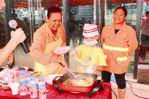 5月28日上午,南宁经济开发区开展“关爱农民工 绿港小厨神”主题亲子活动。辖区内的园林绿化工人、水电维修物业工人、保洁人员等300多名进城务工人员及其子女参加了本次活动。