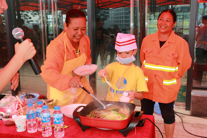 抢答活动结束之后,进入“小厨神”厨艺大比拼环节。由园林绿化工人、水电维修物业工人、保洁人员等进城务工人员组成的5组家庭展开了激烈的厨艺大比拼竞赛。看,小厨神们在父母的指导下井井有条地备菜、炒菜、起锅,忙得不亦乐乎。各色菜式色香味俱全,充分展现了孩子们“小当家”的本领。半小时后,小厨神们在大家的热烈掌声中完成了比赛菜品,厨艺大师及现场观众根据完成的速度、菜品、味道等评出厨艺大赛一等奖1名,二等奖2名,三等奖3名,优秀奖10名。