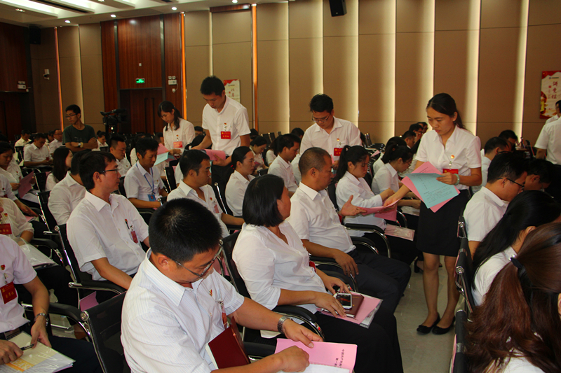 上午八点十分,大会全体工作人员提前到位,大会筹备会务组人员整齐地摆放好签到表、出席证、嘉宾证和列席证,做好迎接大会的准备。计票人、监票人会前碰头,明确分工任务。