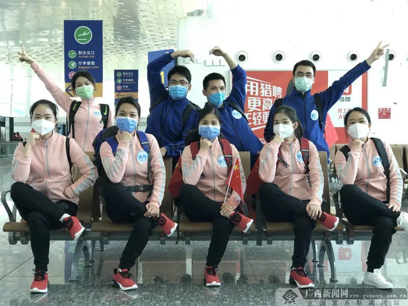 今天11时30分,广西支援湖北第一批医疗队153人出发去武汉天河机场,乘坐14时的飞机返程。