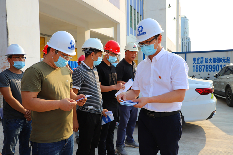 多宝官网党委书记、董事长龚国强给项目一线人员发放《工程建设廉政手册》(张彩秀 摄)