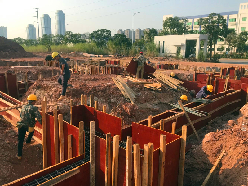 瑞声南宁光学项目主产高精密手机镜头,包括一体式VCM双摄、晶圆级玻璃(WLG)镜头、玻塑混合镜头等,是瑞声核心技术之一,项目的尽快投产对于瑞声公司在美国打压中国通讯产业的大环境下抢占产业链转移先机,抢占市场份额;经开区落实自治区强首府战略、打造千亿产业园等都有着十分重要的意义,是一个多赢格局。项目计划2020年2月上旬正式投产。荣鑫公司在该项目中主要承担附属工程施工,包括设备用房、污水处理厂房、危品库、空压机房主体施工及园区道路、绿化等,是名符其实的配角,但在项目的前期阶段,聚光灯却始终照在这“配角”的身上。附属工程中,设备用房、污水处理厂房等建筑面积共4000平方米,是项目装修、安装的基础工程,投产倒排工期要求2019年12月25日前必须完成并交付安装单位(道路绿化等配合项目总进度,不在此列),工期不足三个月!该部分用房面积虽不大,且大部分只有两层,但由于特殊设计要求且项目处回填区域,涉及桩基、深基坑(5.5米)、高支模(8.3米)、防渗防腐等土建施工难点、费时点,不可控因素多,给工程按期完工带来了极大的困难。该部分项目工程量不大,与后期装修、安装关系密切,本应由装修总包单位统一施工,但装修单位一再推托,坦言不可能完成。最终管委将此部分项目授与了荣鑫公司。此时,装修、安装单位在观望,业主、建设主管部门也都在捏把汗。