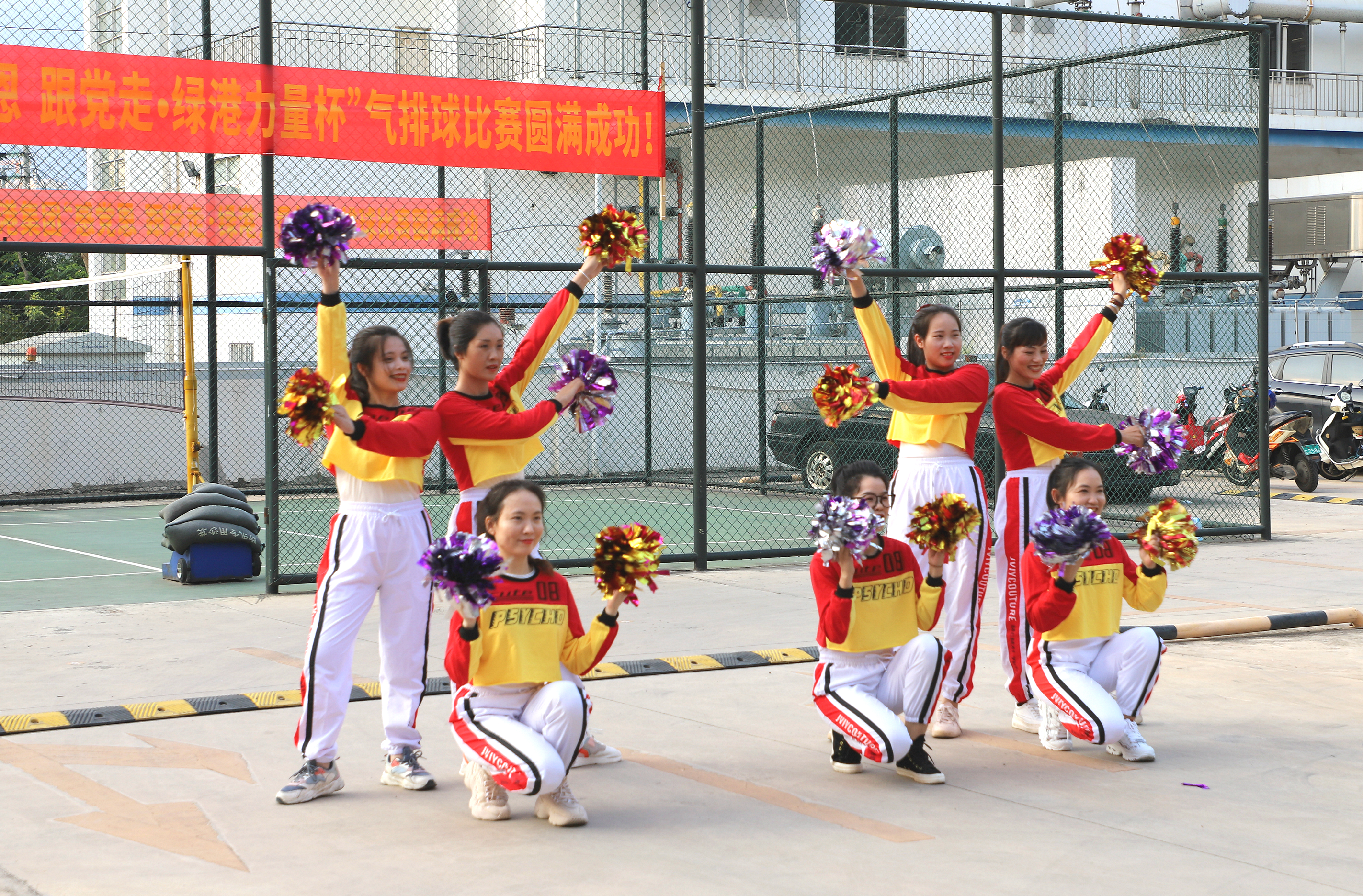 赛场上,运动员们精神抖擞,配合默契,奋力扣球。“好球、好球!”赛场下,啦啦队员热情高涨,赛场上的战况紧紧牵动着他们,每一个得分球都赢得了一阵阵的喝彩声。大家时而紧张握拳,时而高声呐喊助威。青春活力的绿港女神们现场表演的啦啦操更是将气氛推向顶点。