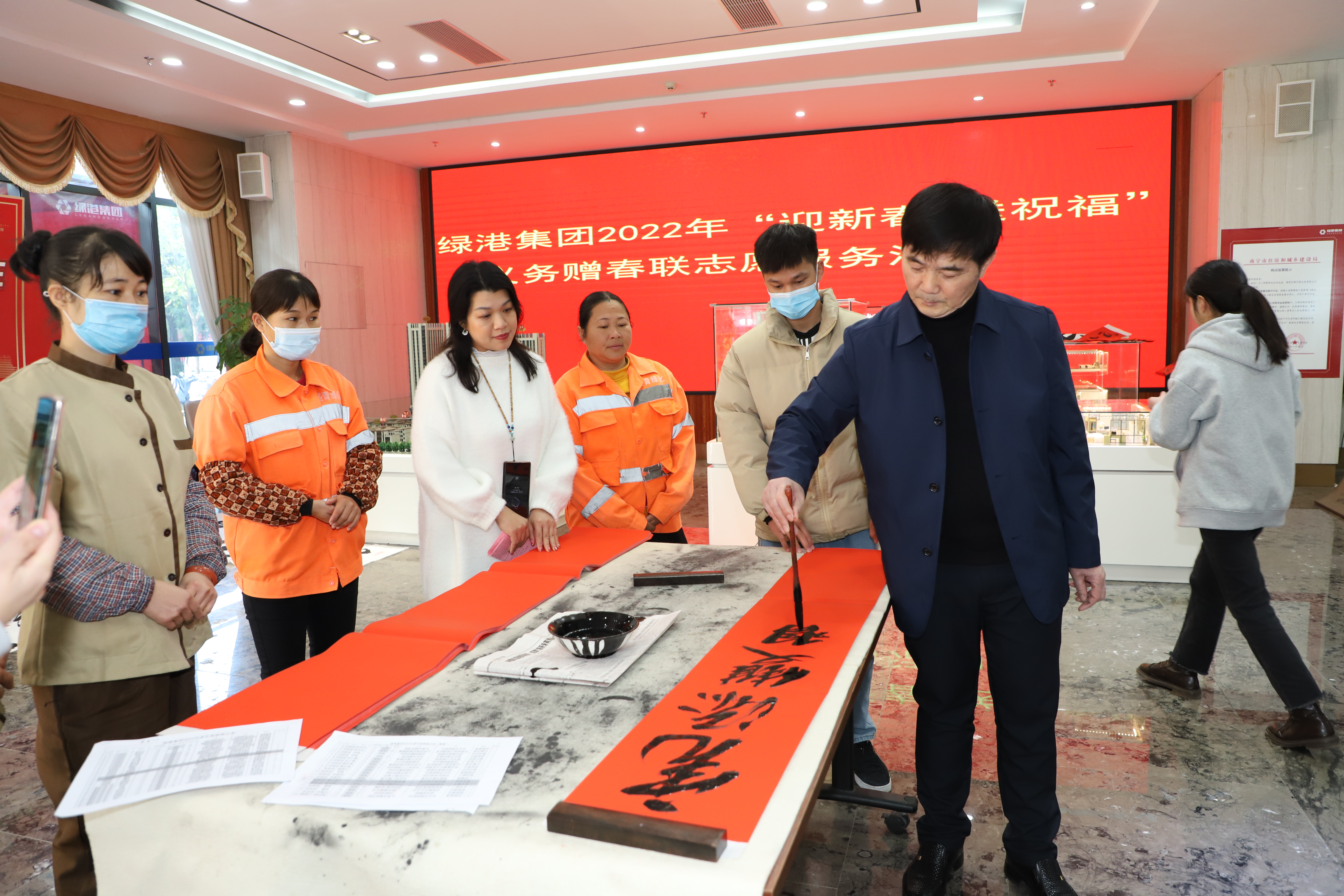 1月19日,集团党委委员、副总经理、工会主席陆羿冰与荣鑫公司领导、万方公司领导、部分职工代表向40名来自一线的市政、绿化工人与物业服务人员赠送了春联,并向他们表达了浓浓的关怀和新春祝福。接过新鲜出炉的春联,万方物业公司保洁人员李琼花喜滋滋的,她说,书法家现写、现送春联很接地气,感觉很亲切、很温暖。“手写的春联,更有年味。今年不用上街去买对联了,真好!”“这写得真好,苍劲有力,我要这副!”……员工们手捧着吉祥喜庆的春联赞不绝口,喜悦之情溢于言表。