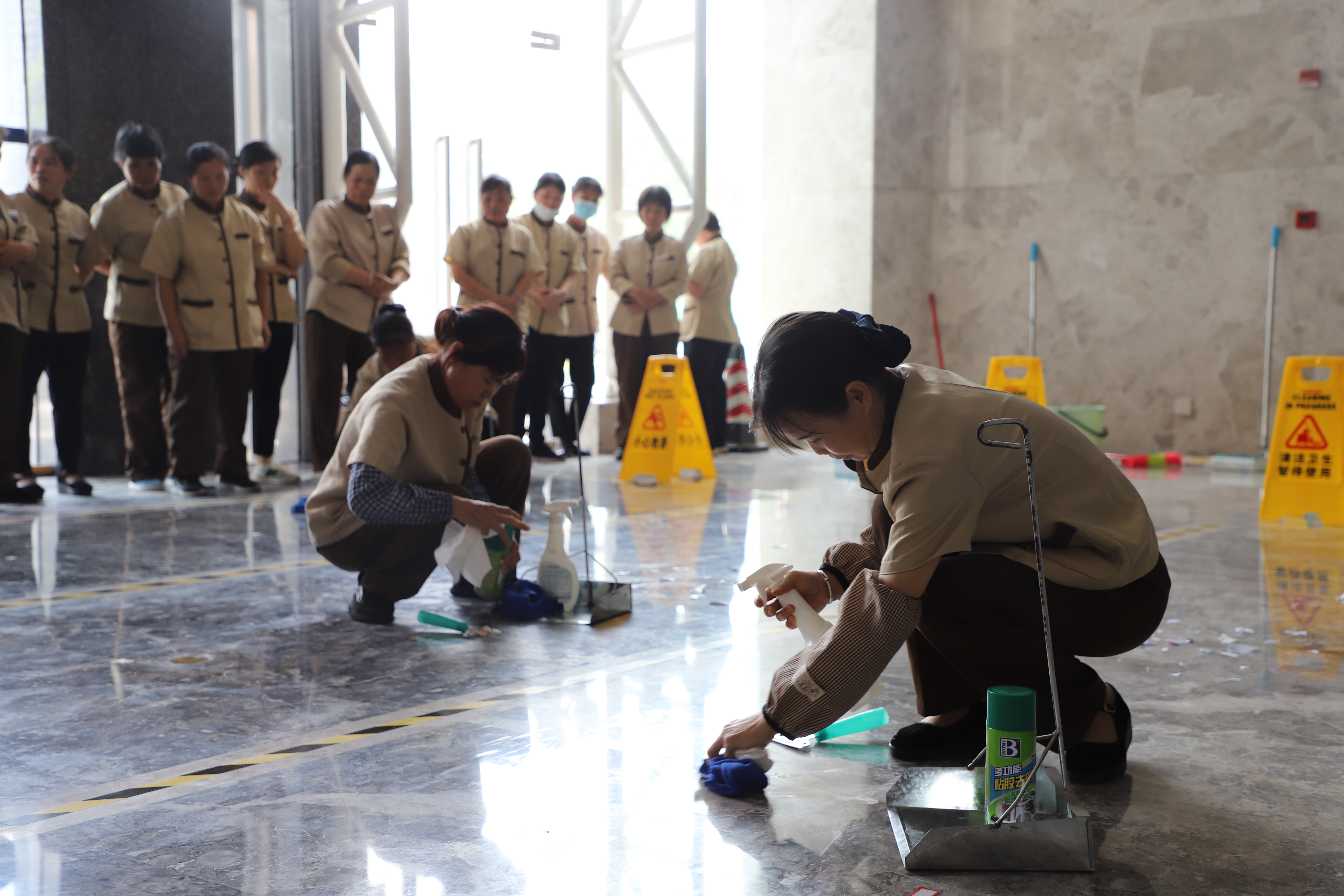 在她们的一双巧手下地板焕然一新充分展现了万方保洁人员的专业风采。
