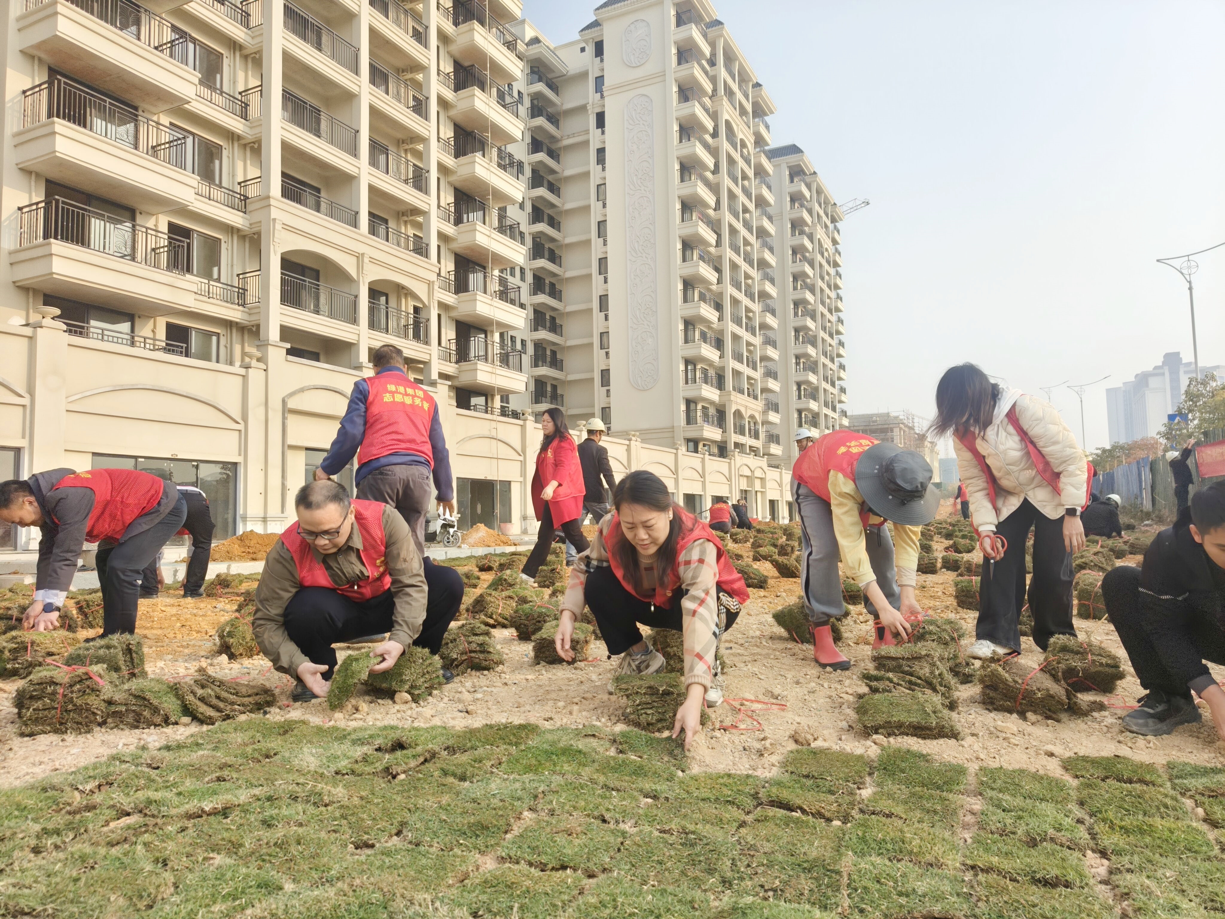 号角既已吹起,行动便无止息。活动中,紧张有序的项目施工现场,呈现出一派热火朝天的景象。嘉通公司党支部、荣鑫公司党支部的党员及入党积极分子们以身作则,与施工人员并肩作战,身着志愿者服装,精神抖擞地投入到草坪铺植工作中。大家各司其职、分工明确,齐心协力,有的负责搬运草皮,有的进行地面平整,有的仔细铺设草皮,有的负责浇水养护,每一个环节都严谨认真、有条不紊,确保施工工程质量和效果经得起检验。经过全员共同努力,短短3个小时,共完成了铺植草皮50000块,草坪面积共计2000㎡,呈现一派生机盎然,切实以实际行动践行初心使命,为项目“保交付”的顺利推进提供了坚实保障。