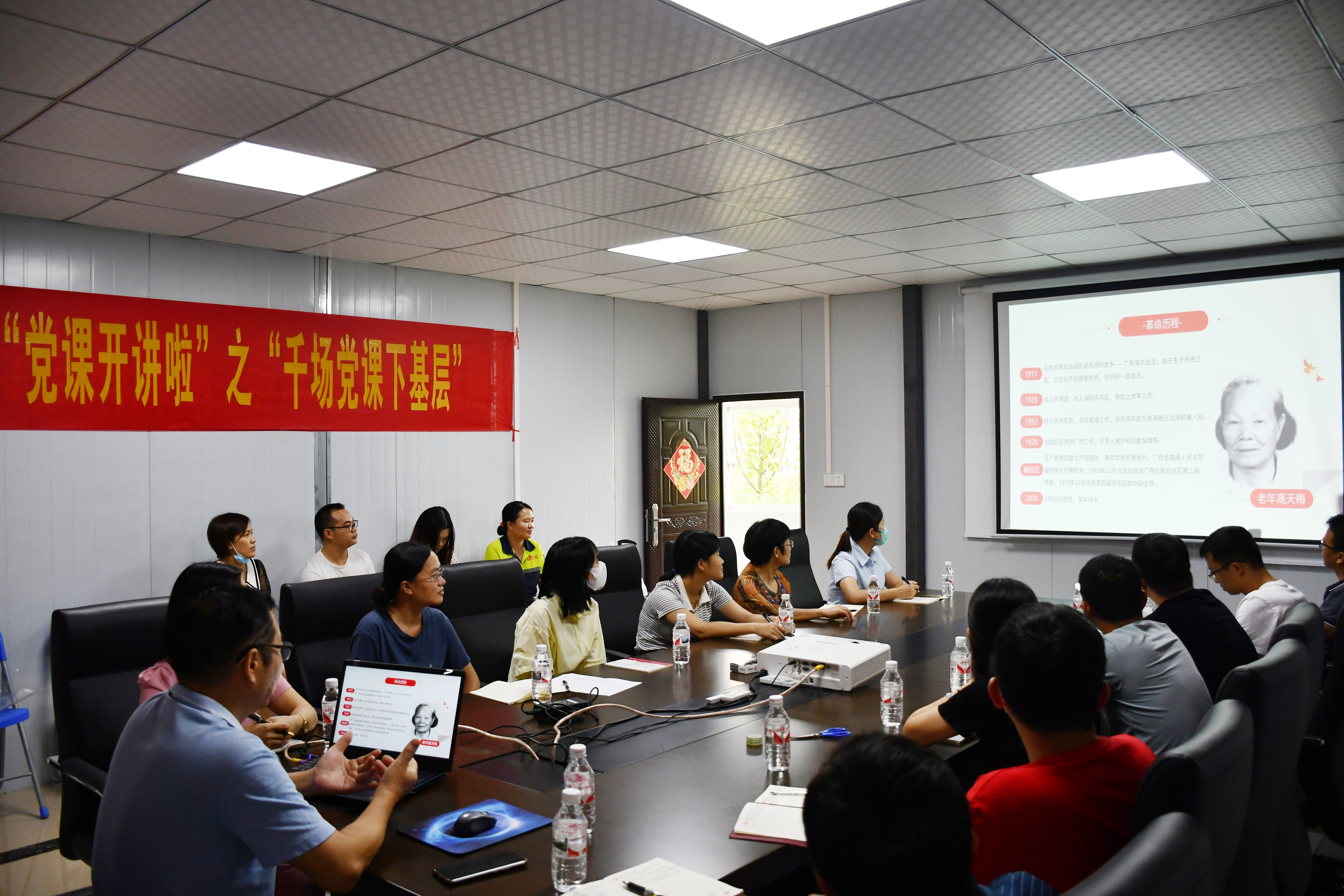 929日,为持续推进“将《红色传奇》进行到底”系列活动,深入贯彻落实基层党建五基三化攻坚年行动部署,积极响应经开区“党课开讲啦”之千场党课下基层的号召,荣鑫公司党支部联合广西长荣混凝土有限责任公司党支部前往长荣公司吴圩混凝土搅拌站开展“将红色传奇进行到底  扬先辈精神再立新功”主题活动荣鑫公司党支部书记李汝埠为荣鑫公司万方公司长荣公司的党员干部一线作业人员送去一堂题为高山一枝梅 暗香天地间的党课,生动讲述了誉为“广西阿庆嫂”的原广西政协副主席高天梅同志革命奋斗一生的“红色传奇”