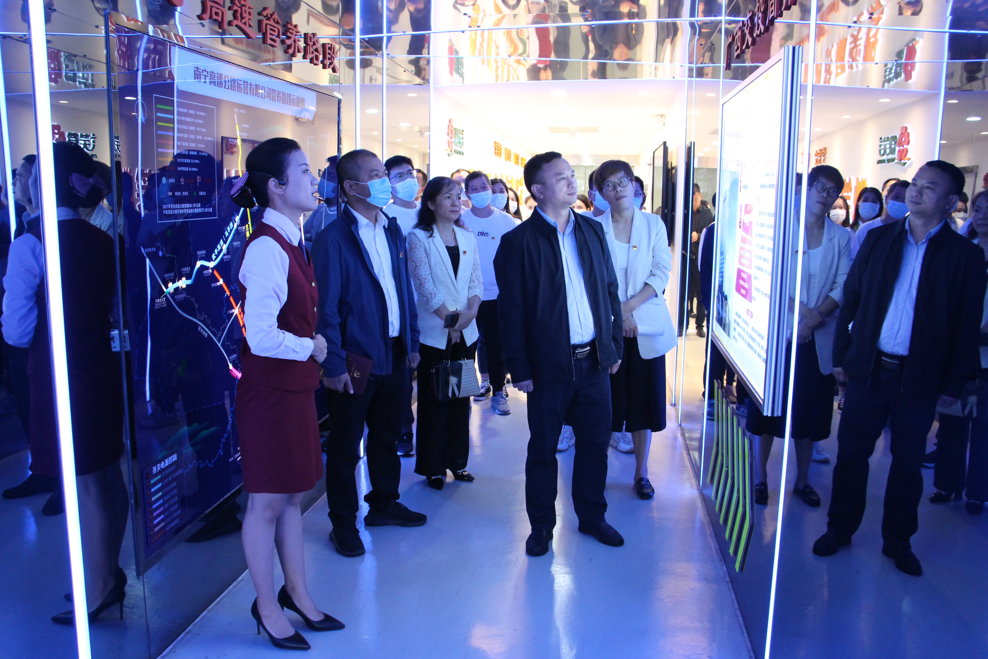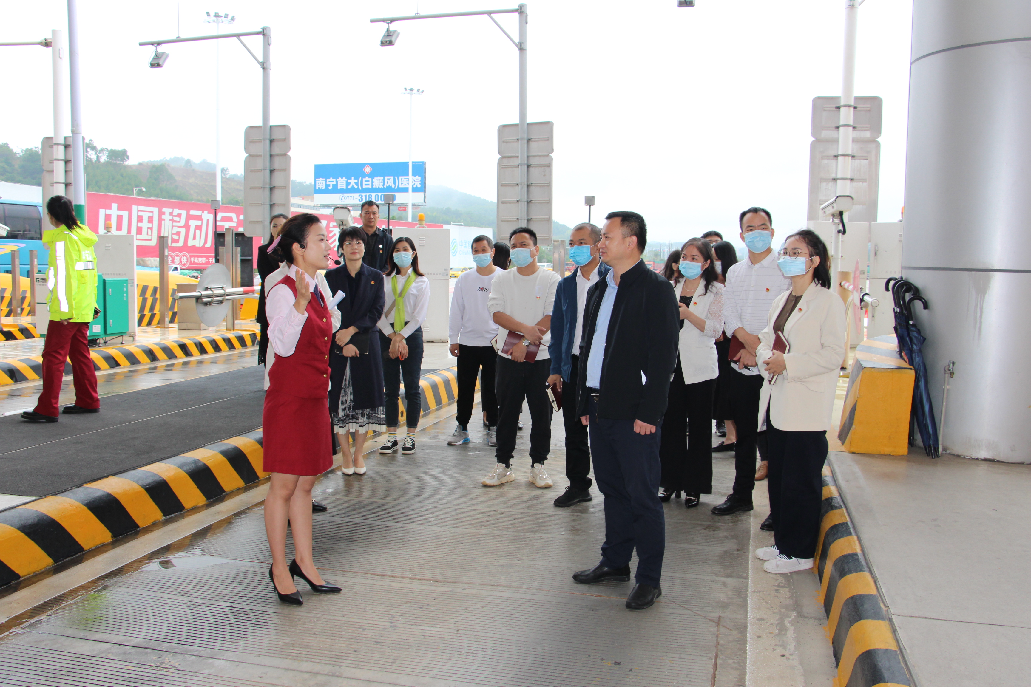 嘉通公司党支部党员们参观了广西交投高速公路运营有限公司南宁东收费站的地下文化长廊、党员活动室、劳模工作室、班组室、书巢等,听取了广西交投集团广西交通投资集团南宁高速公路运营有限公司人事党群部冯主任介绍公司发展历程、人才发展、企业文化与主要成绩、以及党的二十大代表、全国劳动模范农凤娟同志的先进典型事迹,并在书巢就学习宣传贯彻落实党的二十大及党建工作经验等方面进行座谈。