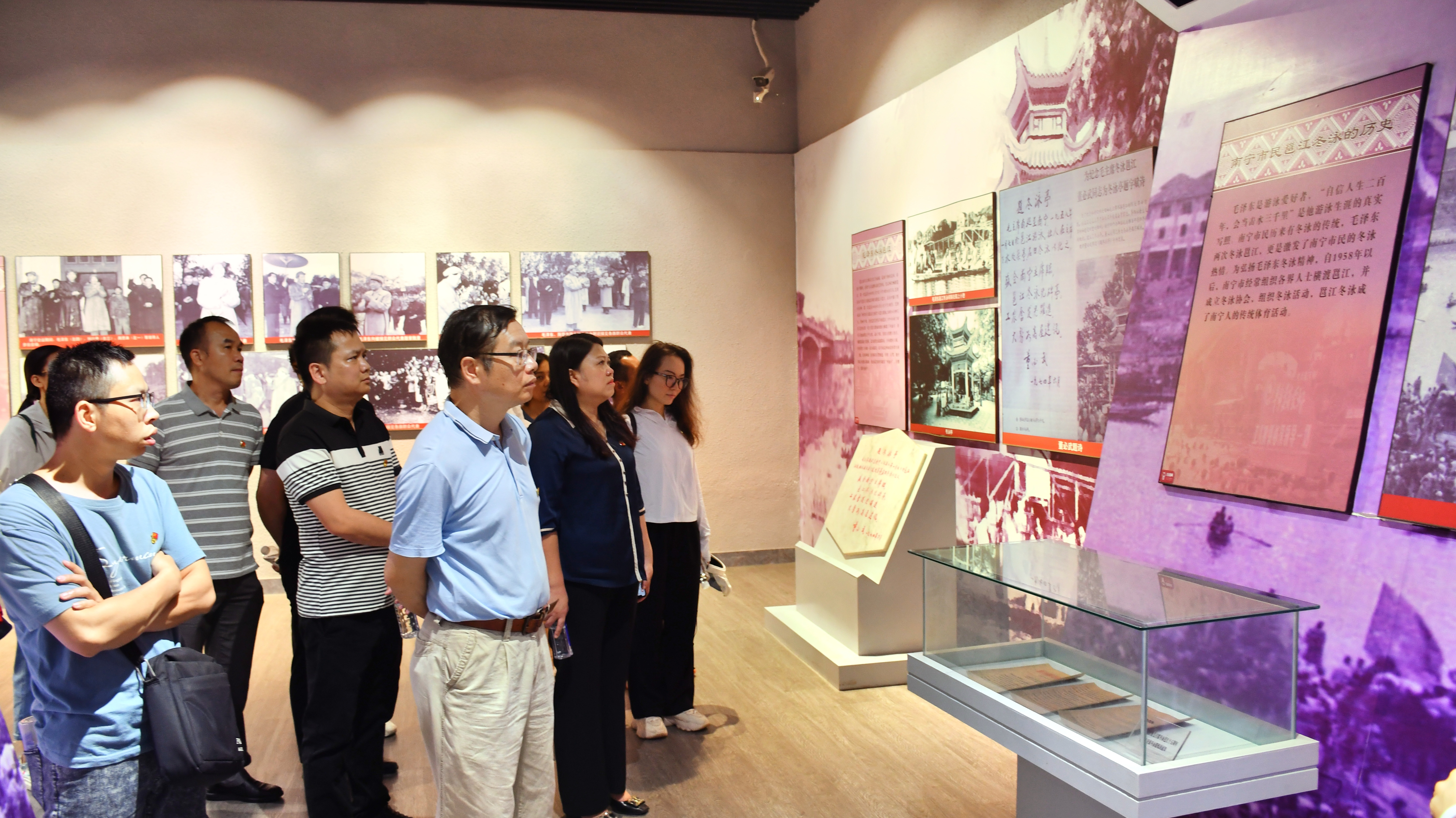 走进纪念馆大门,一块浮雕作品映入眼帘,它再现了1958年毛泽东主席在人民公园望仙坡接见广西各族人民代表的壮观场景。时隔60多年,追寻伟人的足迹,我们一起回忆那段激动人心的光辉岁月。纪念馆通过实物、图片、文字资料的组合,配以声、光、色等现代科技手段,展示了1958年1月毛泽东主席在南宁主持召开中央工作会议期间,接见广西各族人民代表,对广西地方经济发展作出高瞻远瞩指导的活动情况,以及刘少奇、周恩来等党和国家领导人指导广西社会主义现代化建设的历程。党员们跟随着一幅幅照片回顾了人民公园、邕江河畔、军区礼堂等毛泽东主席在广西的历史足迹和广西发展历史。参与主题参观学习的党员纷纷表示:“讲解员的解说非常让人心潮澎湃,参观活动是思想上的传承,激励我们带着这份信念和力量,追随伟人的足迹,把南宁建设得更加美好。”