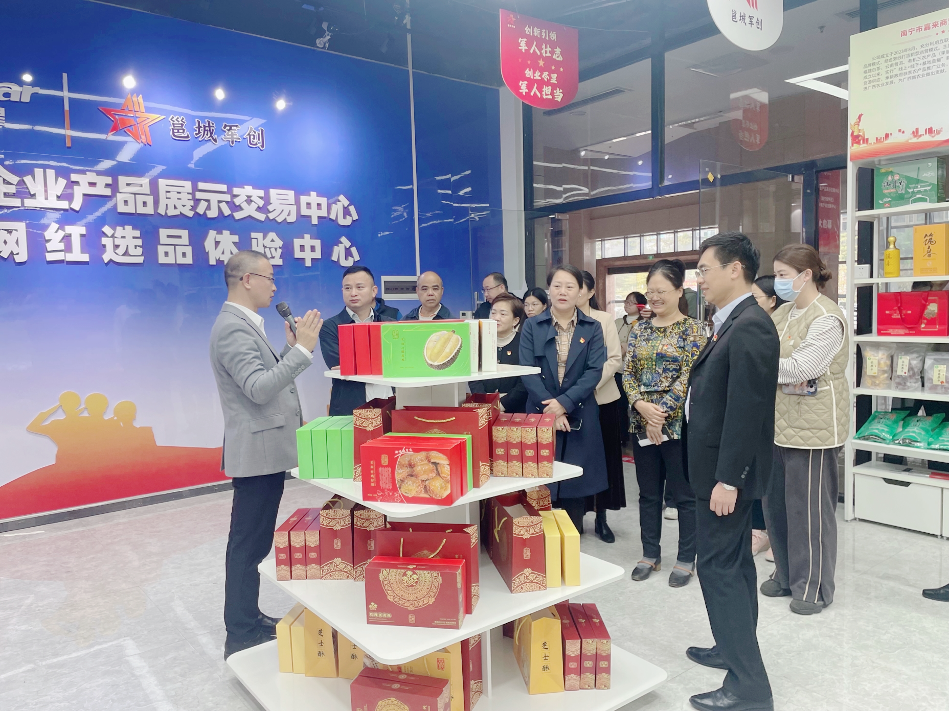 随后,全体人员共同参观了绿港金凯未来产业创新中心,党建基地、企业文化建设长廊、军创会客厅、直播电商网红选品体验中心,了解了孵化环境、孵化成果、基地帮扶等情况,并围绕企业生产情况、产业定位及发展前景等方面进行座谈分享。